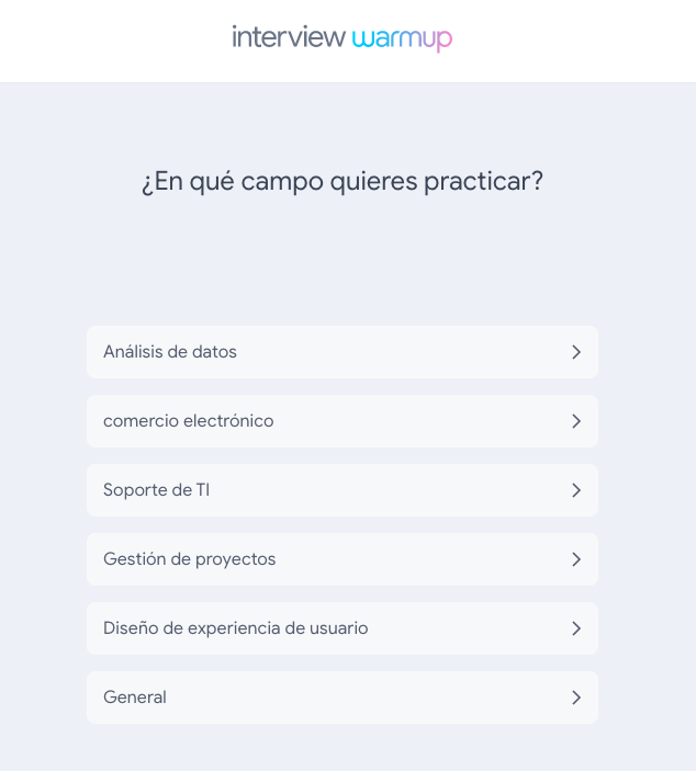 Hasta el momento, la herramienta permite practicar entrevistas de las siguientes áreas de tecnología, pero tiene una opción general que puede utilizar un experto de otra tecnología o área.